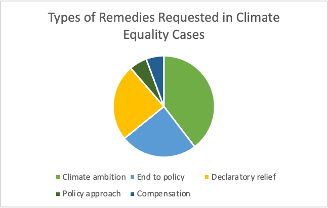 Finally, while compensation is generally understood as narrow and ill-suited to systemic change, compensation requests can be framed in a manner that then goes beyond damages to individuals, including requesting symbolic compensation (like the 100 CAD/claimant in the ENVironnement JEUnesse case) or demanding compensation sufficient to repair social and environmental harms. In this way, compensation requests in climate equality litigation can form part of broader calls for climate reparations that recognize the links between climate change loss and damage and other systemic harms.[76] Overall, these findings suggest that while most climate equality litigation thus far does not seek to bring about transformational change related to underlying systemic discrimination, there are still circumstances under which such cases can contribute to this kind of change.
